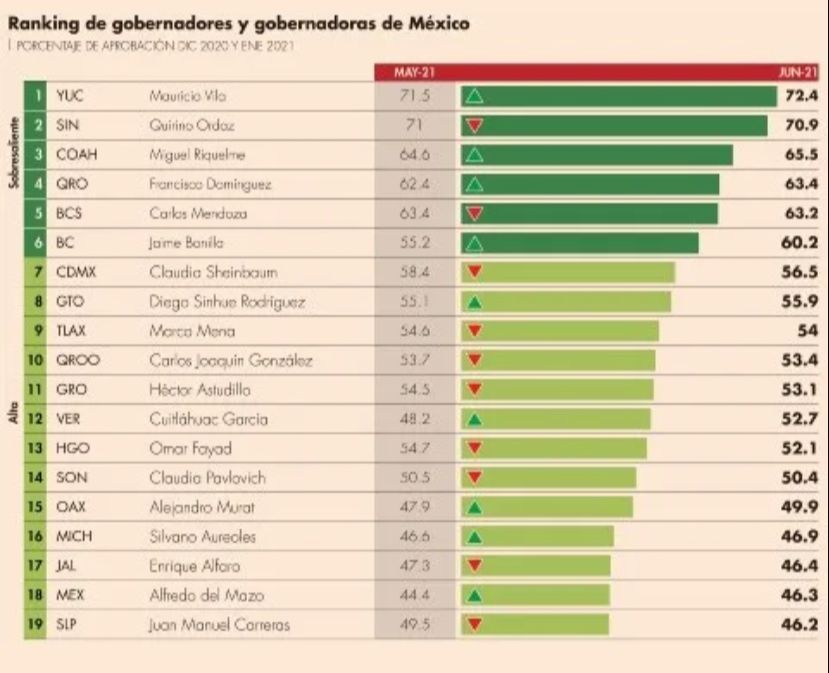 Sobre el lugar que ocupa junto con los mejores gobernadores de MORENA, comparte podio con Jaime Bonilla Valdez (sexto lugar nacional) de Baja California y Claudia Sheinbaum Pardo (séptimo) de la Ciudad de México.