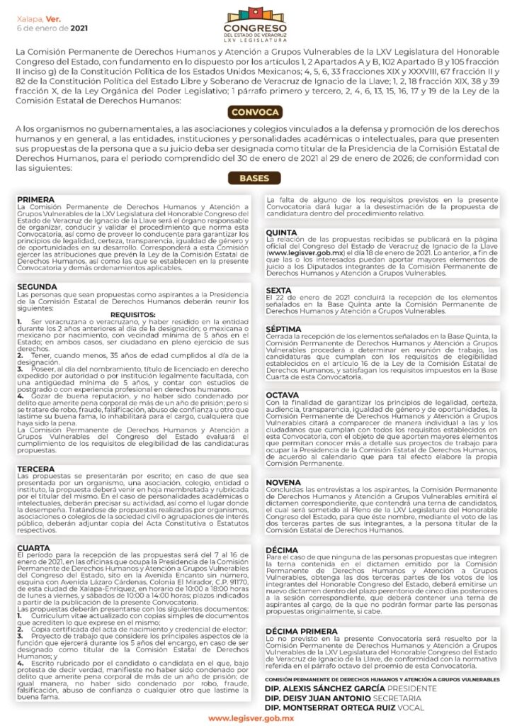 Con fundamento en lo establecido en la Constitución Política local, en la Ley Orgánica del Poder Legislativo y en la Ley de la Comisión Estatal de Derechos Humanos, todas del estado de Veracruz de Ignacio de la Llave, y ante la próxima conclusión del periodo para el que fue electa la actual titular de la Comisión Estatal de Derechos Humanos (CEDH), la LXV Legislatura emite, este 6 de enero, la Convocatoria para los trabajos de elección y designación de quien ocupará este cargo del 30 de enero de 2021 al 29 de enero de 2026.