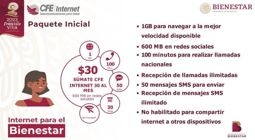 Explicó que, con una sola recarga de 30 pesos, se podrá contar con 1 GB de internet para navegar a la mejor velocidad disponible, 600 MB para redes sociales, 100 minutos de servicio de telefonía para llamadas nacionales y 50 mensajes SMS, servicios que serán gratuitos durante el primer mes para los beneficiarios de los programas sociales que reciban de regalo el chip que distribuirá la delegación de Bienestar principalmente en comunidades rurales, además de tener la posibilidad de acceder a la red de Wi-Fi sin costo en los puntos de acceso que se instalan de manera estratégica en diversos lugares, primordialmente en escuelas, plazas públicas, Centros de Salud, Bancos del Bienestar, etc.