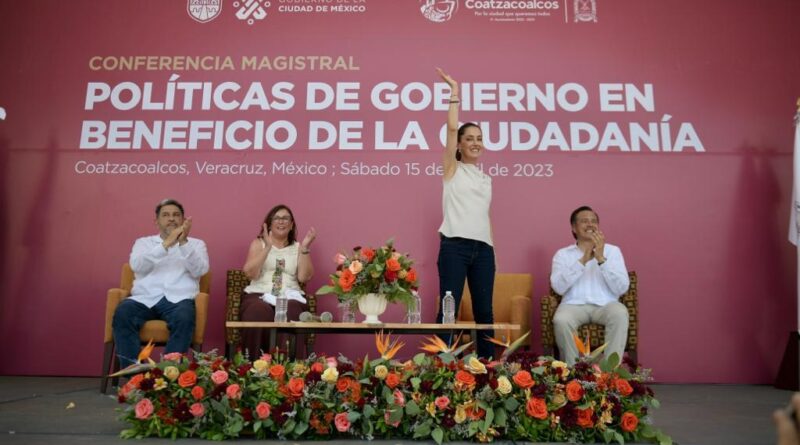 Coatzacoalcos, Ver., 15 de abril de 2023.- Como una compañera ejemplar de la Cuarta Transformación calificó el gobernador Cuitláhuac García Jiménez a la jefa de Gobierno de la Ciudad de México, Claudia Sheinbaum Pardo, al darle la bienvenida para la disertación de la conferencia magistral Políticas del gobierno en beneficio de la ciudadanía.