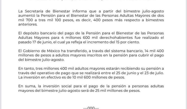 Nuestros adultos mayores podrán disponer desde el día de hoy su pensión correspondiente a los meses de julio y agosto.