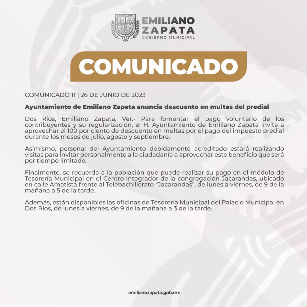Para fomentar el pago voluntario de los contribuyentes y su regularización, el H. Ayuntamiento de Emiliano Zapata invita a aprovechar el 100 por ciento de descuento en multas por el pago del impuesto predial durante los meses de julio, agosto y septiembre.