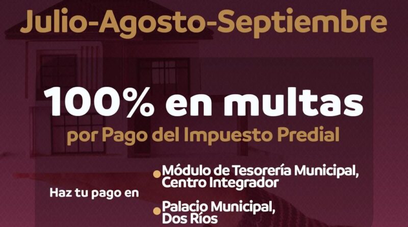 Para fomentar el pago voluntario de los contribuyentes y su regularización, el H. Ayuntamiento de Emiliano Zapata invita a aprovechar el 100 por ciento de descuento en multas por el pago del impuesto predial durante los meses de julio, agosto y septiembre.