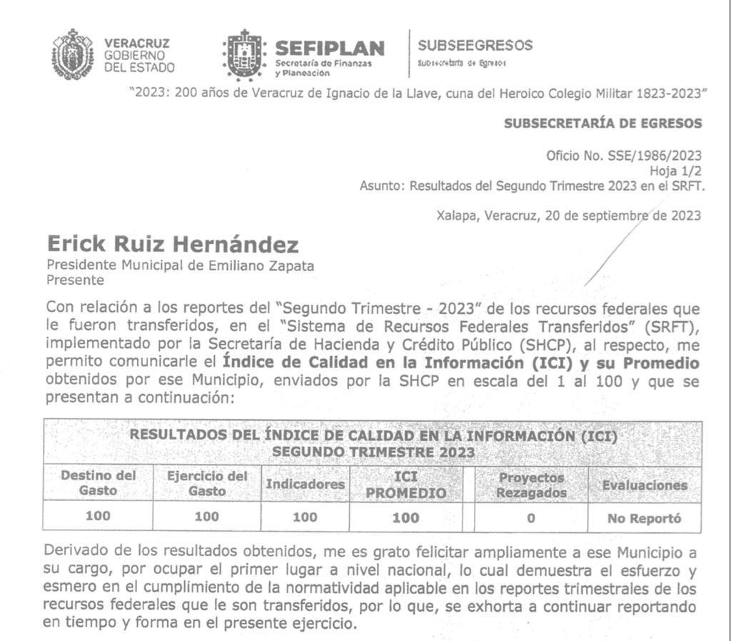 Emiliano Zapata, Ver.- La Secretaría de Hacienda y Crédito Público (SCHCP), del Gobierno de México, reconoció al Ayuntamiento de Emiliano Zapata, encabezado por el alcalde Erick Ruíz Hernández, por ocupar el primer lugar nacional en calidad de información sobre la ejecución de los recursos federales que recibe para acciones y obras públicas en beneficio de la población.
