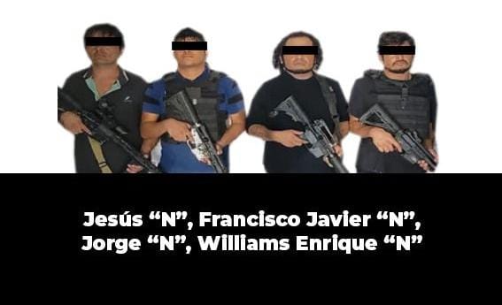 Con prontitud, elementos operativos le marcaron el alto a Jesús “N”, Francisco Javier “N”, Jorge “N” y Williams Enrique “N” quienes agreden con arma de fuego a los elementos de policía al realizar su detención se les aseguraron cuatro armas de fuego largas, cargadores, cartuchos útiles, placas y chalecos balísticos y dos vehículos