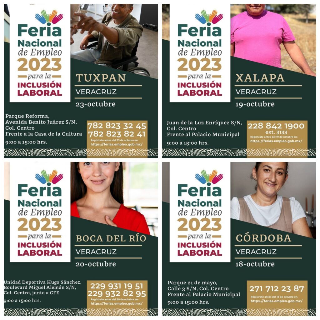 Xalapa, Ver., 17 de octubre de 2023.- Los próximos 18, 19, 20 y 23 de octubre, Córdoba, Xalapa, Boca del Río y Tuxpan serán sedes de la Feria Nacional de Empleo para la Inclusión Laboral, cuyo objetivo es acercar oportunidades que privilegian la inserción de adultos mayores, mujeres, jóvenes, personas con discapacidad y migrantes, refugiados o desplazados.