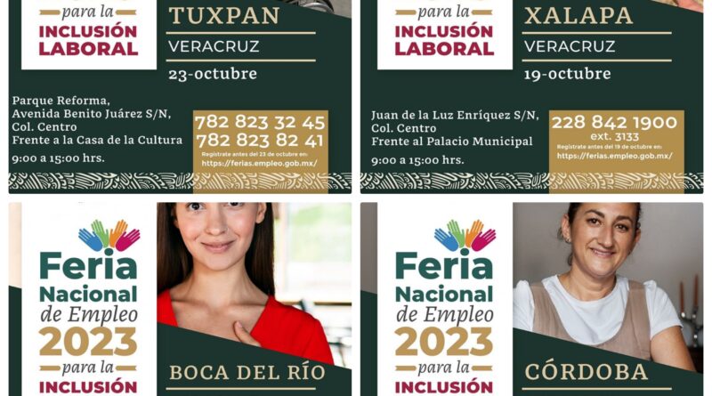 Xalapa, Ver., 17 de octubre de 2023.- Los próximos 18, 19, 20 y 23 de octubre, Córdoba, Xalapa, Boca del Río y Tuxpan serán sedes de la Feria Nacional de Empleo para la Inclusión Laboral, cuyo objetivo es acercar oportunidades que privilegian la inserción de adultos mayores, mujeres, jóvenes, personas con discapacidad y migrantes, refugiados o desplazados.