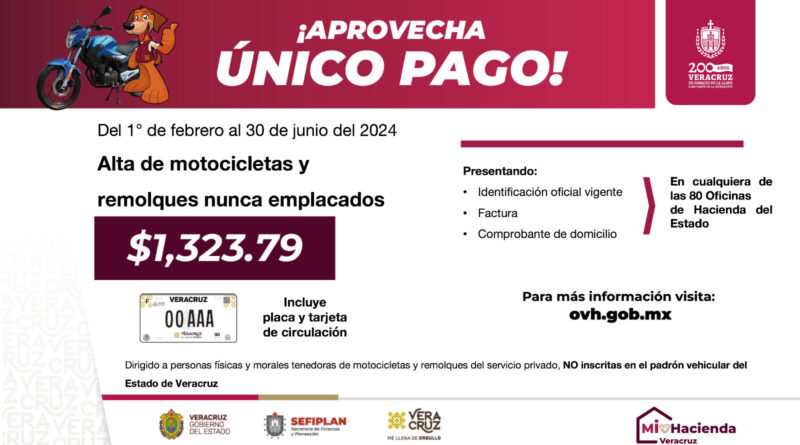 Xalapa, Ver., 31 de enero de 2024.- A partir de mañana y hasta el 30 de junio estará en vigor un decreto para otorgar beneficios fiscales a personas físicas y morales dueñas de motocicletas y remolques no registrados en el padrón vehicular de Veracruz, consistente en el cobro único de mil 323.79 pesos, sin tomar a cuenta el rezago de años anteriores.