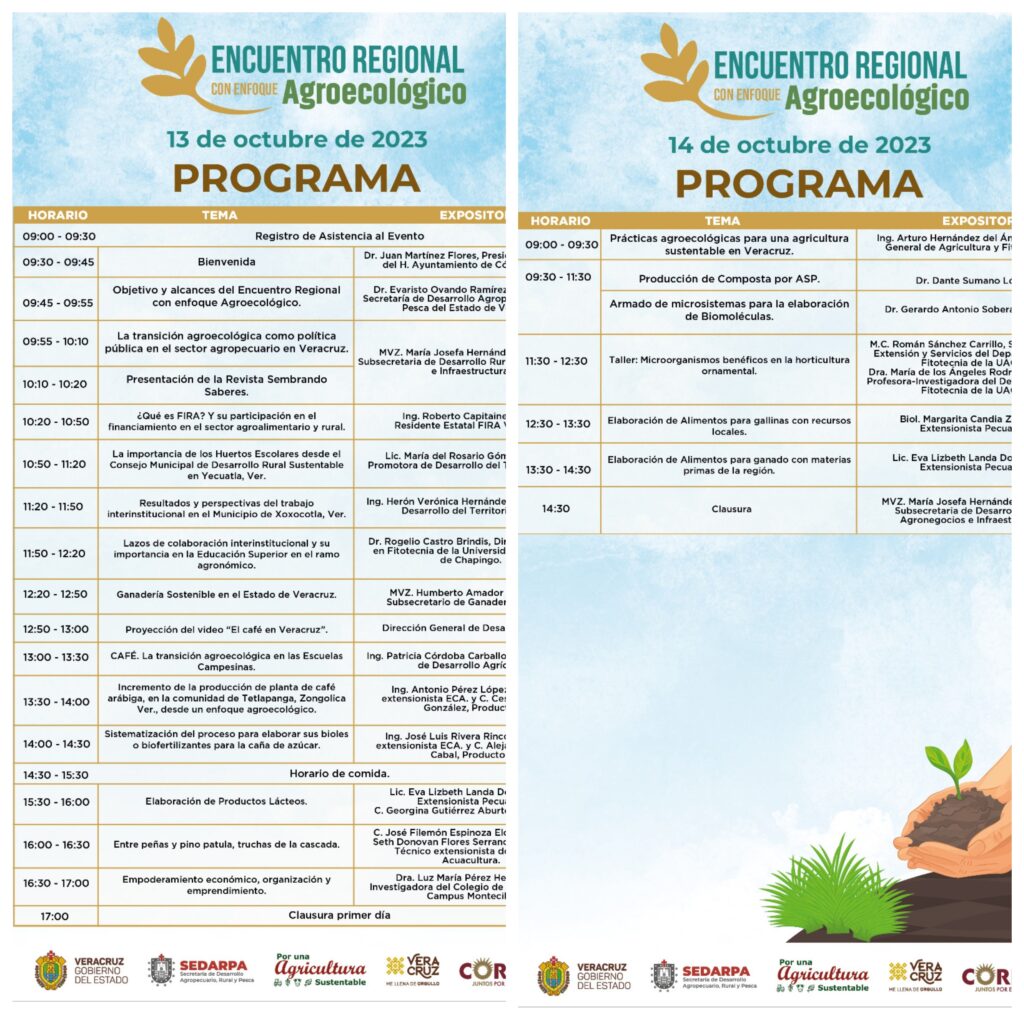 Xalapa, Ver., 10 de octubre de 2023.- La Secretaría de Desarrollo Agropecuario, Rural y Pesca organiza el primer Encuentro Regional Agroecológico que tendrá lugar en la exhacienda San Francisco Toxpan, en Córdoba, donde productores agropecuarios y pesqueros podrán intercambiar saberes con visitantes de Chiapas, Hidalgo, Oaxaca, Puebla, San Luis Potosí, Tabasco y Tlaxcala.