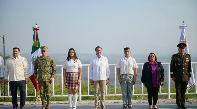 Ahí tuvo lugar el izamiento de la bandera con los honores a cargo de la escolta y banda de guerra de la Secretaría de Seguridad Pública, el juramento dirigido por Ángel de Jesús Muñoz, alumno de tercer grado de la telesecundaria Luis Donaldo Colosio Murrieta, y la entonación del Himno Nacional.