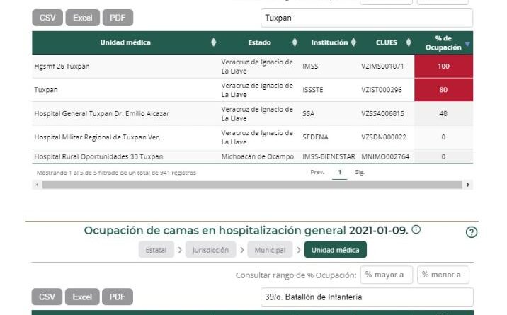 En el caso de camas con ventilador, los Hospitales Covid de Tuxpan aparecen con 0 por ciento de ocupación.