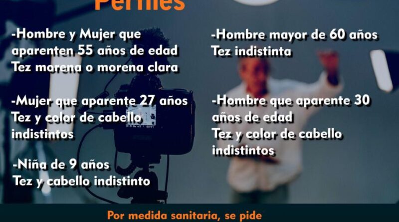 Esta producción busca los siguientes perfiles: hombre y mujer que aparente 55 años de edad, tez morena o morena clara. Hombre mayor de 60 años, tez indistinta. Mujer que aparente 27 años, tez y color de cabello indistintos; hombre que aparente 30 años, tez y color de cabello indistintos y una niña de 9 años tez y cabello indistinto.
