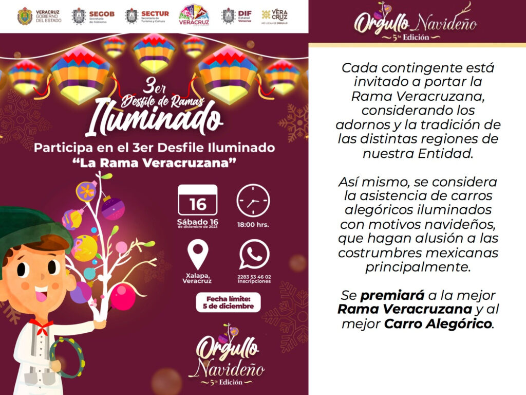 En Xalapa tendrá lugar el tercer Desfile Iluminado con la temática de La rama veracruzana, siendo premiadas las mejores representaciones. Estas acciones tienen el objetivo de seguir promoviendo la integración familiar y la generación de espacios de sana recreación y convivencia en entornos seguros.