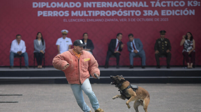 Xalapa, Ver., 03 de octubre de 2023.- Al menos 90 oficiales de 10 países de América Latina han egresado del Diplomado Táctico K9: Perros Multipropósito impartido por el Agrupamiento Canino de la Fuerza Civil, que hoy inaugura la tercera edición internacional en técnicas y habilidades preventivas del delito en el que participarán 15 instructores de cinco nacionalidades.