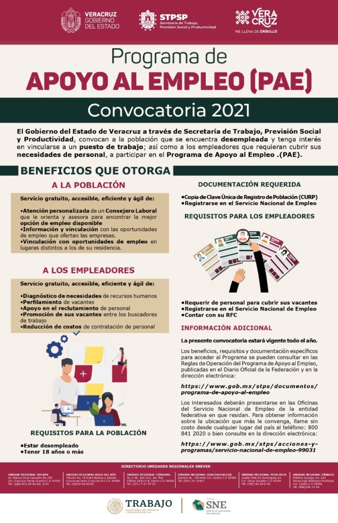 Xalapa, Ver., 06 de septiembre de 2021.- El Gobierno de Veracruz, a través de la Secretaría de Trabajo, Previsión Social y Productividad (STPSP), convoca a buscadores de empleo y empresas a inscribirse en el Programa de Apoyo de Empleo (PAE), cuya finalidad es colocar en sitios y actividades formales a quienes enfrentan barreras para incorporarse al sector productivo.