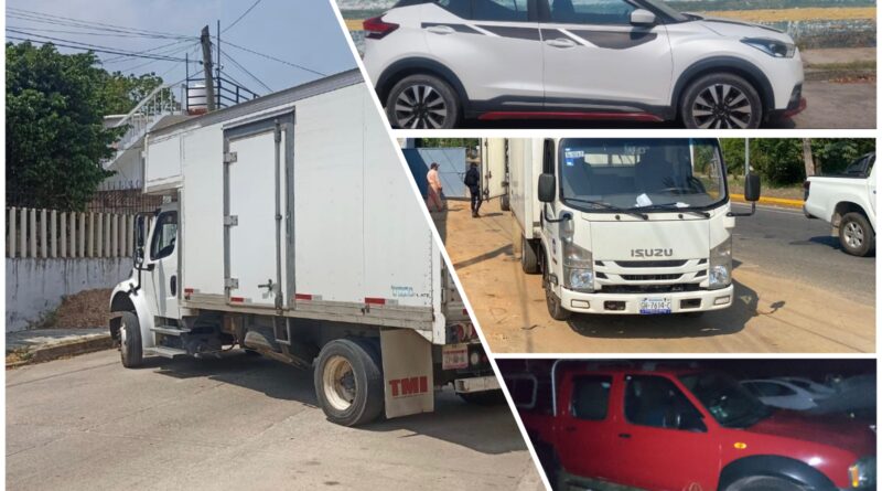 Finalmente, en Cosamaloapan, Ciudad Isla, Minatitlán, Oteapan y Coatzacoalcos se recuperaron: vehículos Nissan, placas XJ5632A, YVX970A, 853ZZT y PAC6236; motocicletas Italika, sin placas y placas DT125; camión Isuzu, placas GH7614C; camión Freightliner, placas 27AD6L y camioneta Nissan, placas XK6725A.