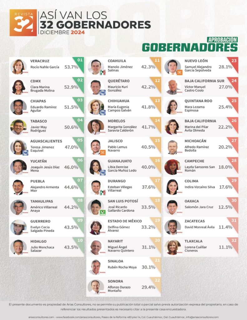 Xalapa, Ver., martes 21 de enero de 2025.- La gobernadora de Veracruz, Rocío Nahle García continúa liderando la lista de aprobación general de los 32 mandatarios mexicanos actualmente en funciones con un sólido 53.7 por ciento de aprobación de acuerdo a la encuesta realizada por Arias Consultores.