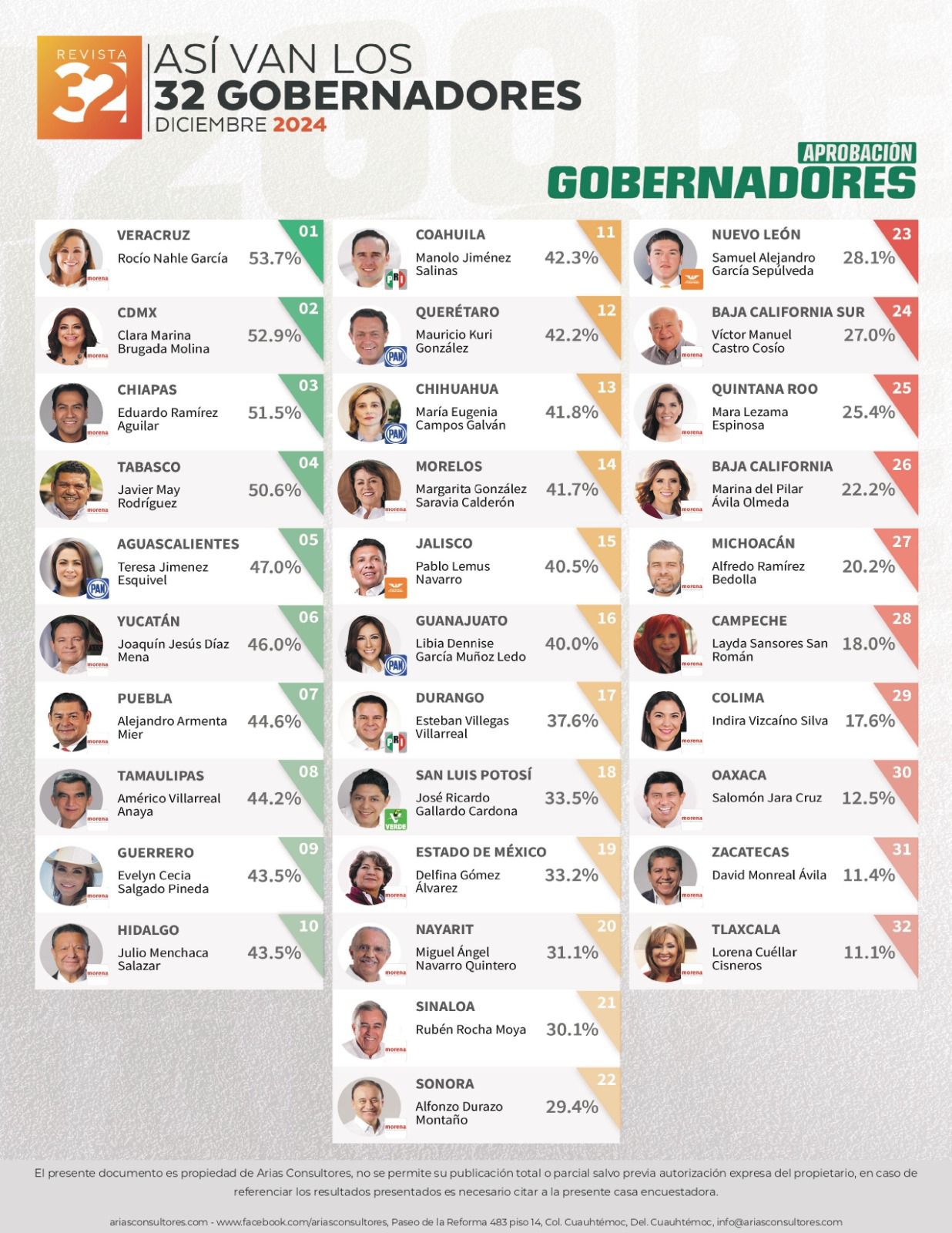 Xalapa, Ver., martes 21 de enero de 2025.- La gobernadora de Veracruz, Rocío Nahle García continúa liderando la lista de aprobación general de los 32 mandatarios mexicanos actualmente en funciones con un sólido 53.7 por ciento de aprobación de acuerdo a la encuesta realizada por Arias Consultores.