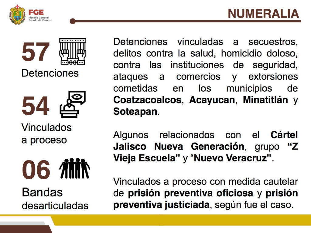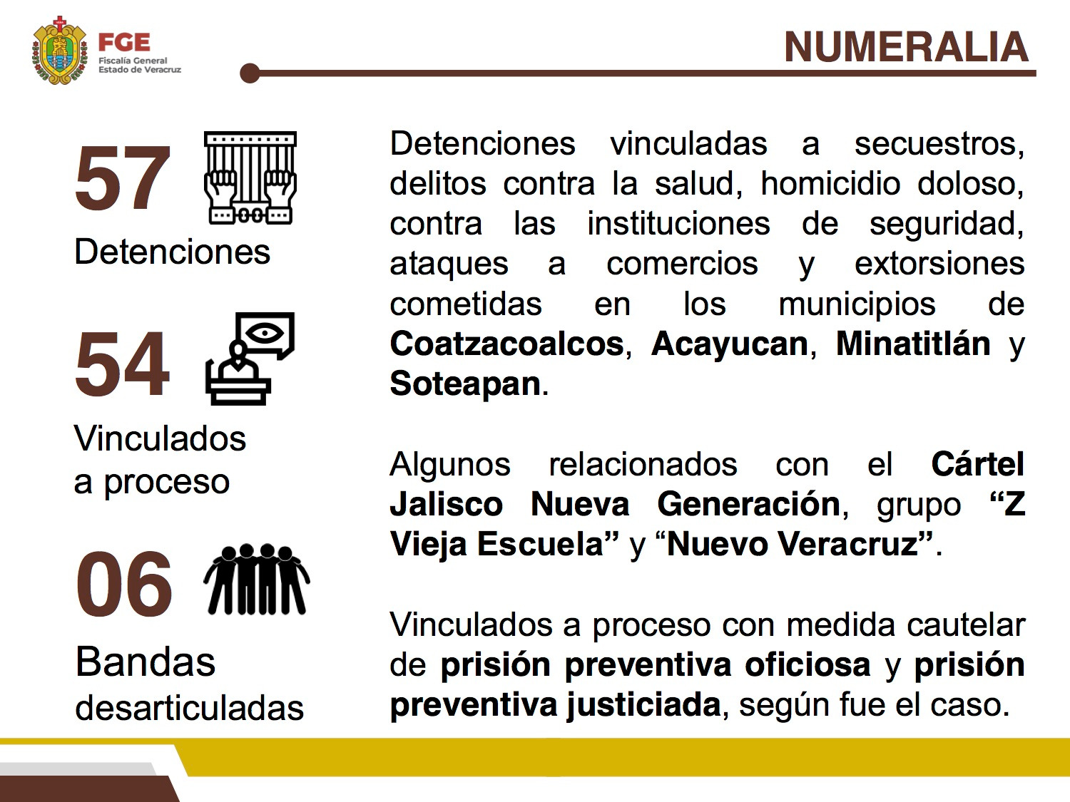 Los operativos han permitido la desarticulación de seis bandas y la vinculación a proceso de 54 personas con medida cautelar de prisión preventiva oficiosa y justificada, según cada caso, algunas de éstas relacionados con el Cártel Jalisco Nueva Generación, grupo Z Vieja Escuela y Nuevo Veracruz.