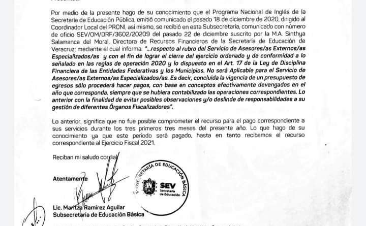 Con la renuncia del coordinador del PRONI quien nos había advertido de todas las irregularidades con Oficialía Mayor y Financieros, el día de ayer viernes 8 de enero, nos avisan que no hay presupuesto para pagarnos de enero a marzo 2021, porque no se pudo comprometer el recurso para pagarnos, a pesar de que ya habíamos firmado por adelantado en el mes de noviembre 2020 todas las nóminas correspondientes hasta marzo del 2021. El dinero estaba en la cuenta de la SEV y al parecer desapareció.