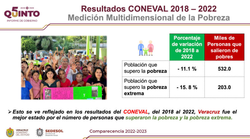 Xalapa, Ver., 24 de noviembre de 2023.- Por número de habitantes, Veracruz es el estado que más redujo la pobreza en los últimos cinco años en México; 532 mil personas superaron la línea moderada (11.1%) y 203 mil la extrema (15.8), destacó el titular de la Secretaría de Desarrollo Social (SEDESOL), Guillermo Fernández Sánchez, en la Glosa del Quinto Informe de Gobierno.